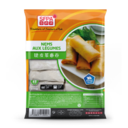Farce 75% (porc 39% (origine : France), carotte, oignon, vermicelle (eau, pois, amidon de maïs et haricot mungo), chou, champignon noir, huile de tournesol, lactoserum et protéine de lait, sucre, exhausteur de goût : glutamate monosodique, sel et poivre) – Galette de riz 25% (riz, tapioca, eau et sel).